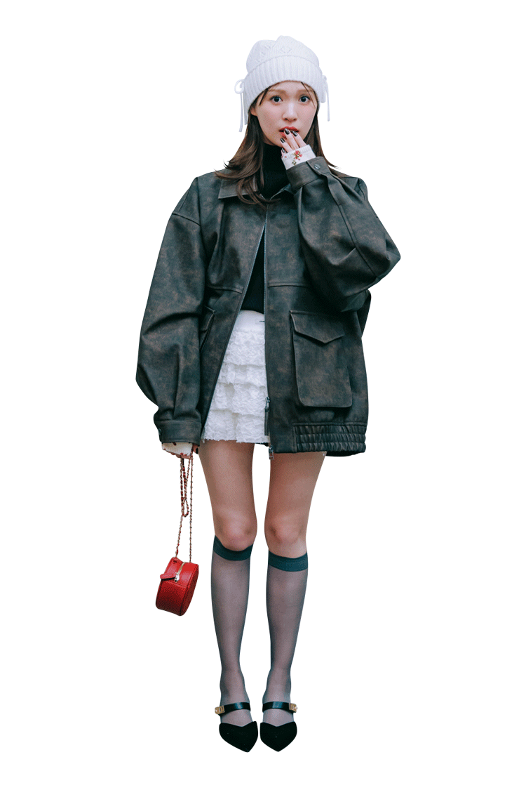 ティアードミニスカートは着回し。レザーブルゾン 6,599円/WEGO タートルネックトップス 2,199円/WEGO ティアードミニスカート 9,640円/CRANK(HANA SHOWROOM)ラメニットビーニー 4,950円/kaorinomori(OVERRIDE ルミネエスト新宿)ニットミトン 2,190円/ZARA(ザラ)バッグ 2,590円/神戸レタス ハイソックス 1,210円/靴下屋(Tabio)ミュール 9,900円/チャールズ&キース(チャールズ&キース ジャパン)