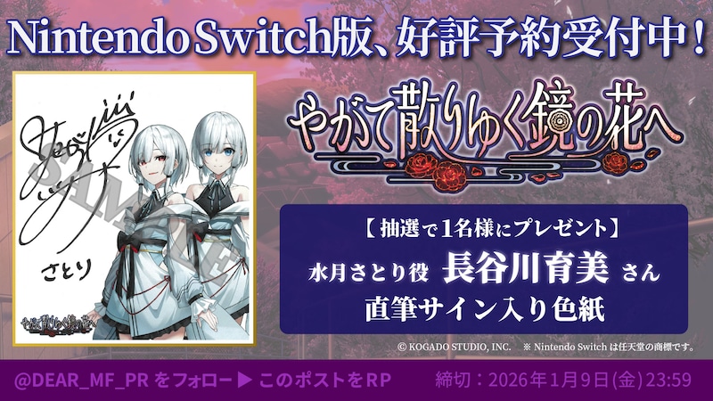 他キャラクターのキャストによる直筆サイン色紙が当たるキャンペーンを今後も開催予定です。最新情報は『やがて散りゆく鏡の花へ』公式X(https://x.com/DEAR_MF_PR )をご確認ください。