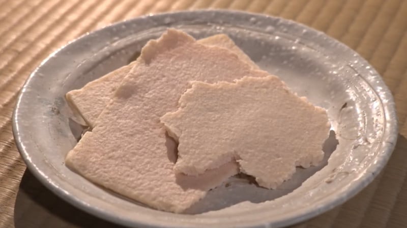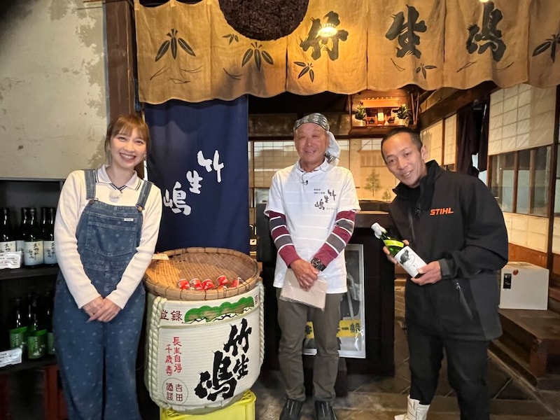 はいださんが「すごくクリーミー!」と堪能した赤カブと酒粕のスープ。この一皿に使われた酒粕は、地元の酒蔵で作られている。吉田酒造を訪れたはいださんは「もとだて」という、蒸した米を発酵してお酒のもとを造る作業を見学する。