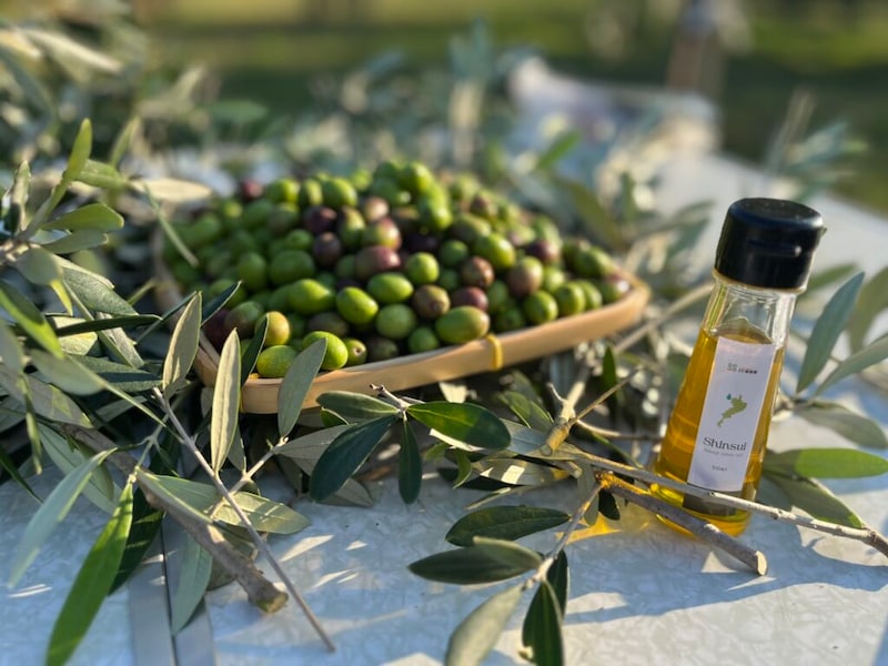 実は、オリーブの実1kgからオリーブオイルになるのは、たった50mlだけ。試飲したはいださんは、少しピリッとした辛味を感じた様子。「辛味が大事なんです。抗酸化作用のあるポリフェノールが多い証拠らしいです」と桂田さん。