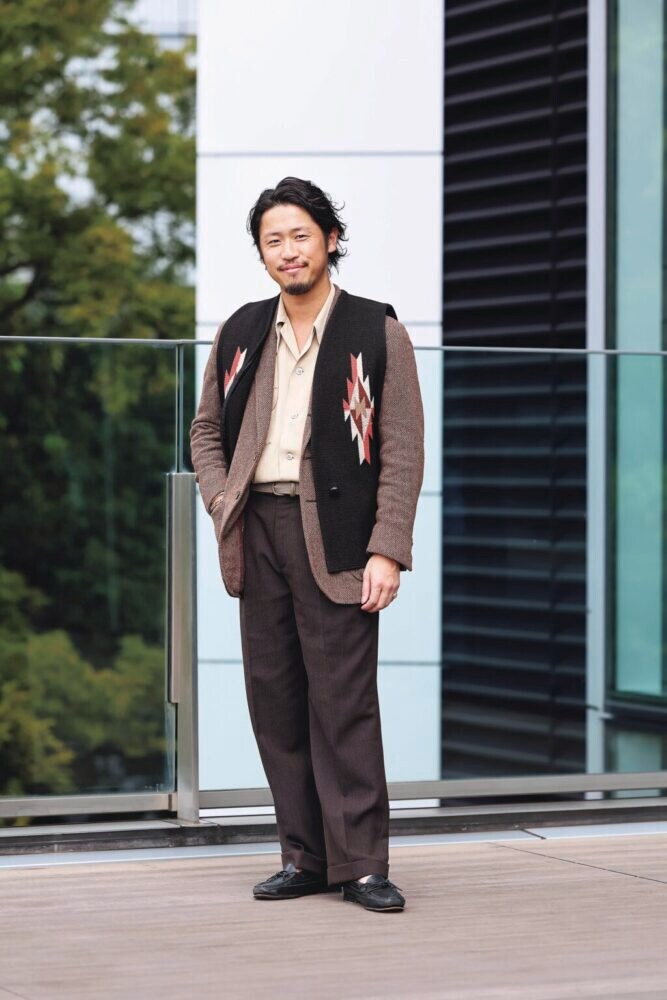 「僕が心掛けているのが、コーデ全体で黒の分量を少なめにすること。今日はブラウントーンで温かみのある雰囲気を作りつつ、そこにあえてトラッドとは正反対のアメリカのチマヨベストをプラス。ハンドクラフト感のあるブラックのアイテムなら堅くなりがちな雰囲気も緩和され、ベストなので分量も少ないため、うまくバランスを取れるんです。あえて黒をアクセントにするのも一興ですね」