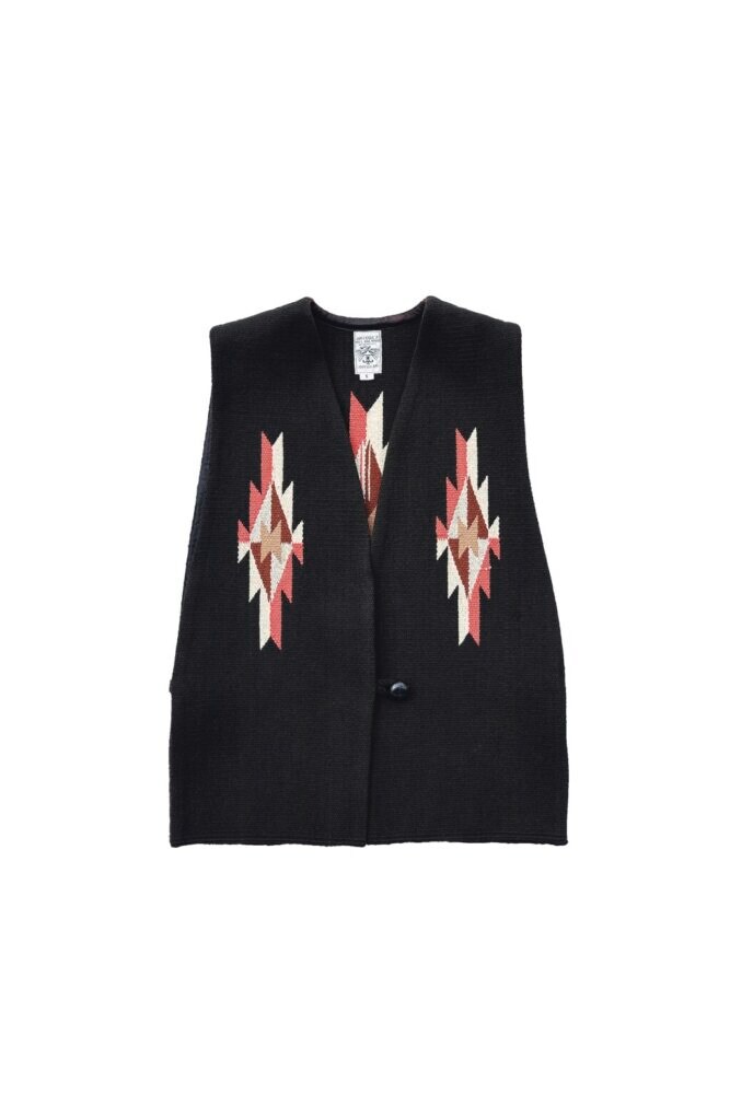 ニューメキシコ州チマヨ村で先祖代々8代に渡って、昔ながらの製法で作るオルテガのベスト。レアなブラックに加えて、シェファーズベストと呼ばれる両サイドにボタンの付く珍しいデザイン。茶系のカラーリングを用いた柄も珍しいヴィンテージだ。私物