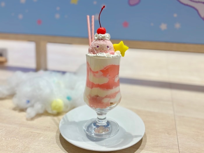 ララをイメージしたストロベリーアイスのパフェ☆甘酸っぱいストロベリーのアイスに、プルプル食感のゼリー、ふわふわの雲のような可愛らしい見た目と味わいのコントラストを楽しみながら、お写真映えもバッチリです。