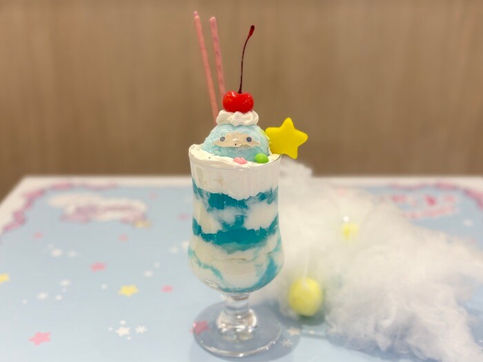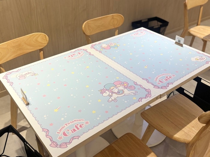 テーブルは、淡い水色を基調としたキラキラと煌めくお空の世界で、キキ&ララと一緒に、カフェメニューを撮影するのにぴったりな特別仕様のテーブルになっています。