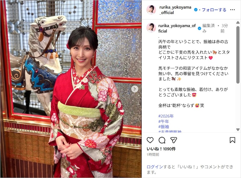 横山は「丙午の年ということで、振袖は赤の古典柄で どこかに干支の馬を入れたいとスタイリストさんにリクエスト 馬モチーフの和装アイテムがなかなか無い中、馬の帯留を見つけてくださいました」と記し、写真を投稿。馬のモチーフを取り入れた帯留めに色鮮やかな赤の着物をまとった姿を披露し、「とっても素敵な振袖、着付け、ありがとうございました 金杯は″乾杯″ならず笑」とつづった。
