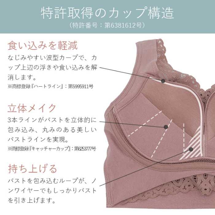 「Sweet Night Bra」は、メッシュテープを使用した特許取得のパターン(特許番号:第5185887号)を採用。バストの大きさに応じて伸縮するため、自然にバージスラインへフィットします。
