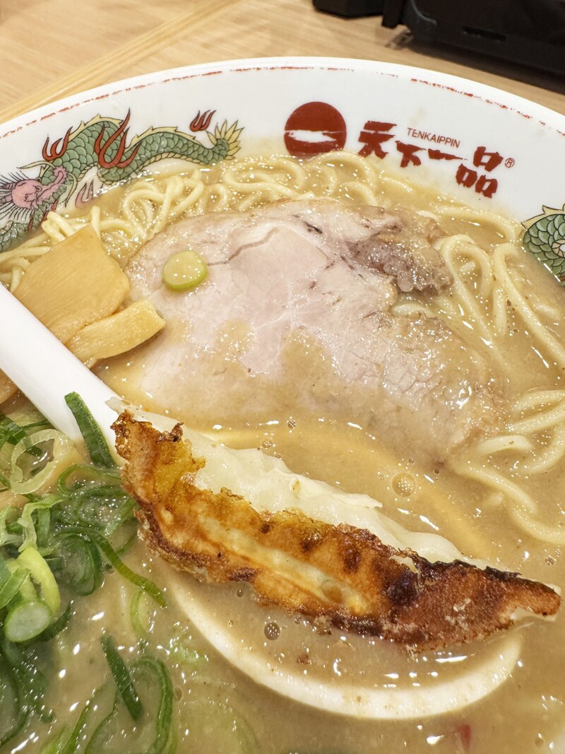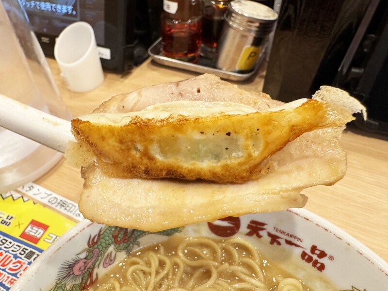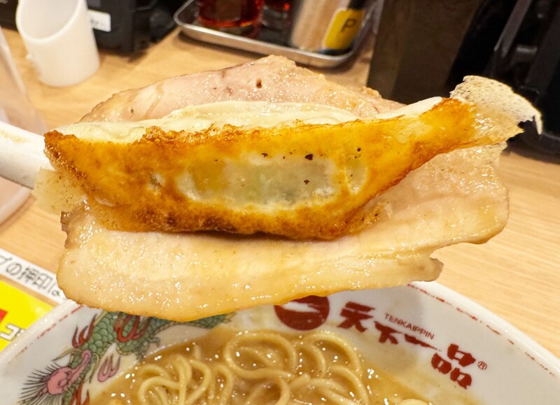 レンゲにスープとチャーシューと餃子をのせて食べて良き。