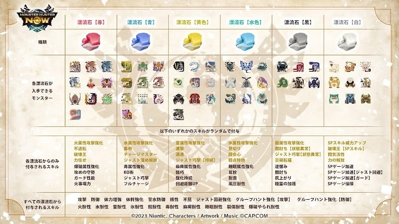 各漂流石が狙える対象のモンスター表や、公式から提案されている漂移錬成おすすめ装備なども合わせて紹介していく。