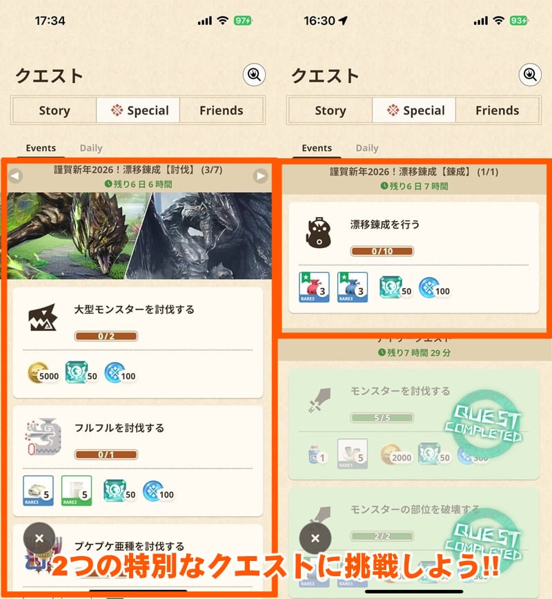 瞬間錬成剤を最大で7個獲得(毎日達成した場合)できるほか、期間限定クエスト“謹賀新年2026! 漂移錬成【討伐】”では対象のモンスター素材。“謹賀新年2026!漂移錬成【錬成】”では武器精錬材と防具精錬材をそれぞれ3個獲得できる。