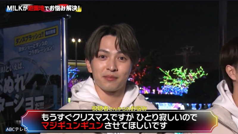 イルミネーションがきらめく夜の遊園地で、「クリスマスに1人寂しいので、マジぎゅんぎゅんさせてほしい」というリクエストを視聴者からもらったM!LK。そこで、俳優としてドラマや映画で活躍している佐野と山中が、お題をもとに全⼒でリクエストに応えることに!