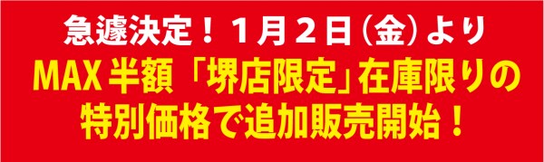 MAX半額「堺店限定」在庫限りの特別価格も急遽追加決定!