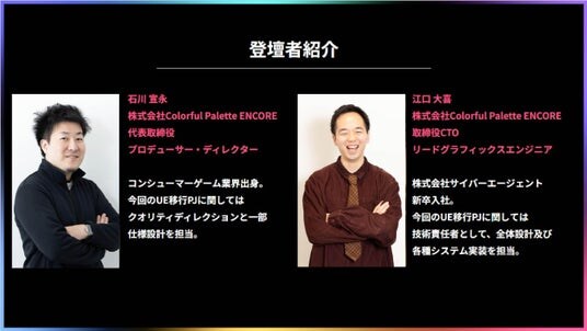 CyberAgentグループの傘下にある株式会社Colorful Palette ENCORE(代表取締役:石川 宣永 以下、当社)はこの度、代表取締役 石川宣永と取締役CTO 江口大喜が、12月10日に開催されたエピック ゲームズ ジャパン主催のUnreal Engine勉強会「Cinematic Deep Dive’25」に登壇し、『プロジェクトセカイ COLORFUL LIVE 5th - Frontier -(以下、セカライ5th)』におけるUnreal Engine活用例を紹介しました。