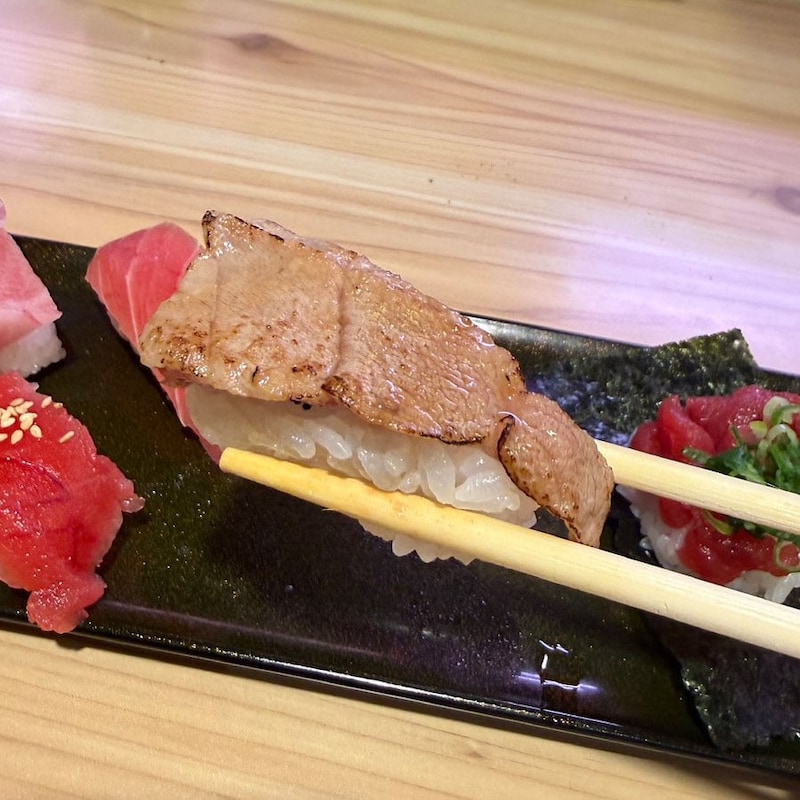 中とろ焦がし醤油、香ばしく炙られた中トロは、また別の風味で脂の風味を感じることができて飽きない。