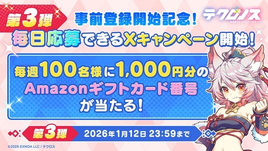 合同会社EXNOA(本社:東京都港区、CEO:東條 寛、URL:https://games.dmm.com)と株式会社テクロス(本社:京都府京都市右京区、代表:辻 拓也、URL:https://techcross.co.jp)は、4つの刻が交差するクロスヒロインRPG『テクロノス』(https://techcronoss.com)の事前登録者数が10万人を突破したことを発表。これによりサービス開始後にガチャチケット5枚の配布が決定した。