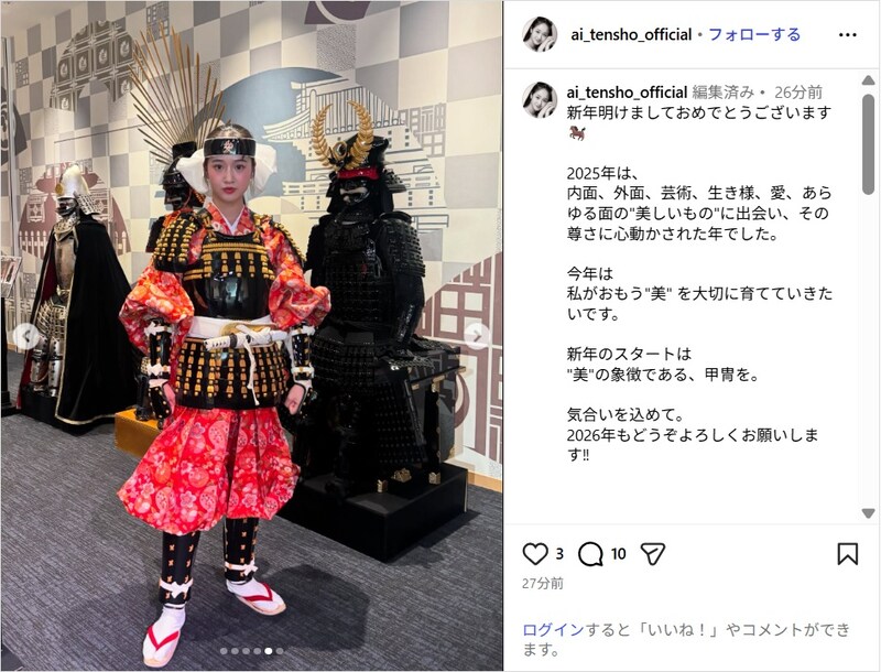 天翔は「新年明けましておめでとうございます」と新年の挨拶から始まり、「2025年は、内面、外面、芸術、生き様、愛、あらゆる面の”美しいもの”に出会い、その尊さに心動かされた年でした」と振り返った。そして「今年は私がおもう”美” を大切に育てていきたいです」と意気込みを述べ、「新年のスタートは”美”の象徴である、甲冑を」と赤と黒の甲冑姿を披露し、「気合いを込めて。2026年もどうぞよろしくお願いします!!」と呼びかけて投稿を締めくくった。