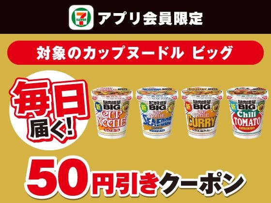1月5日から18日までの期間、セブン-イレブンのアプリ会員限定で、対象の「カップヌードル ビッグ」に使える50円引きクーポンが毎日1枚もらえます。