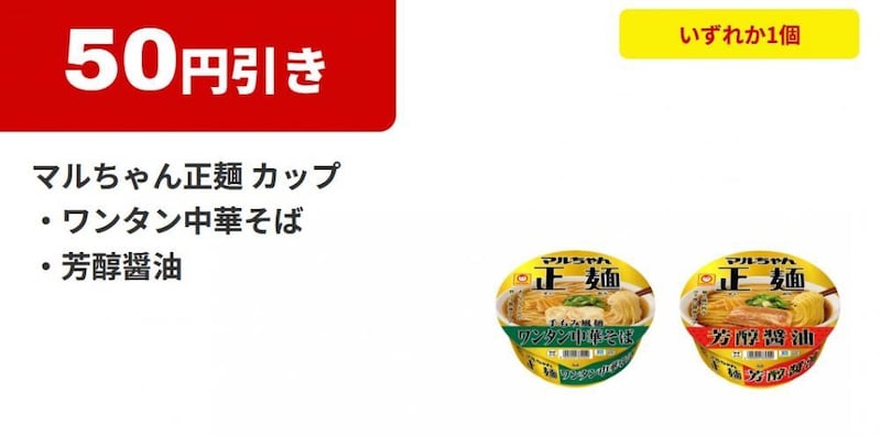 対象商品「マルちゃん正麺 カップ」の「ワンタン中華そば」「芳醇醤油」のうち、いずれか1個が50円引きになります。