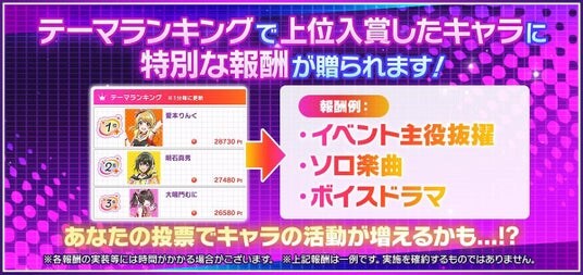 「テーマランキング」への投票を行うと、「サポーターランキング」にもポイントが加算される仕組みとなっており、ライブを遊んで投票することで、両方のランキングで上位を目指すことができます。