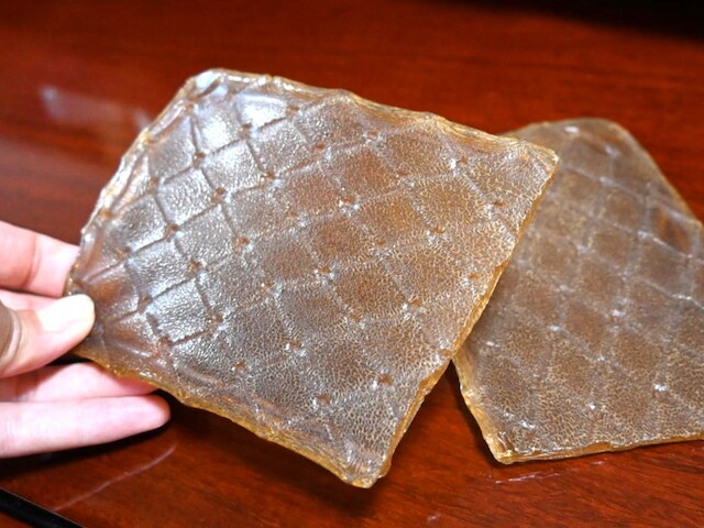 にかわは動物性コラーゲンを主成分とする天然の接着剤。にかわが溶けると独特のにおいが出るため、匂い消しとして香料(クスノキから抽出される樟脳)を使います。これが、墨をすった時にほのかに香る“墨の香り”なのだとか。