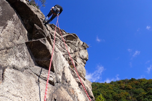 高低差約40mの岩壁を、ロープに沿って登っていきます。コースは参加者のレベルに応じて設定されており、初めてでも無理なく挑戦できる構成です。