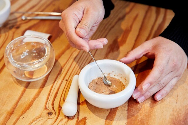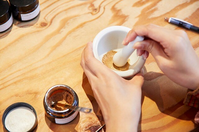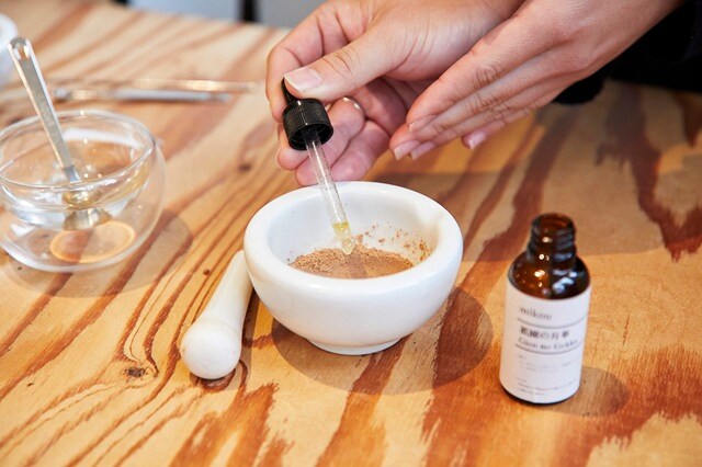香料を混ぜ合わせたら、つなぎの役割をするタブノキの皮の粉末「たぶ粉」、水、アロマオイルを加えてペースト状にしていきます。