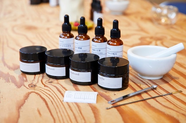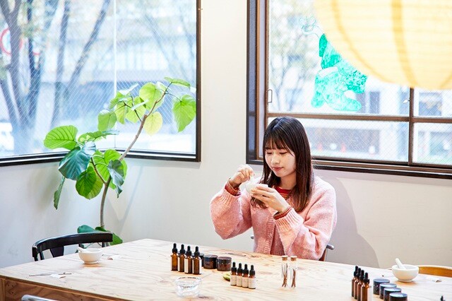 香料の配分で香りの印象が変わるので、香りを確かめながら少しずつ混ぜて“好きな香り”に近づけていきます。香りに迷ったら、アドバイスをもらえるのも安心です。