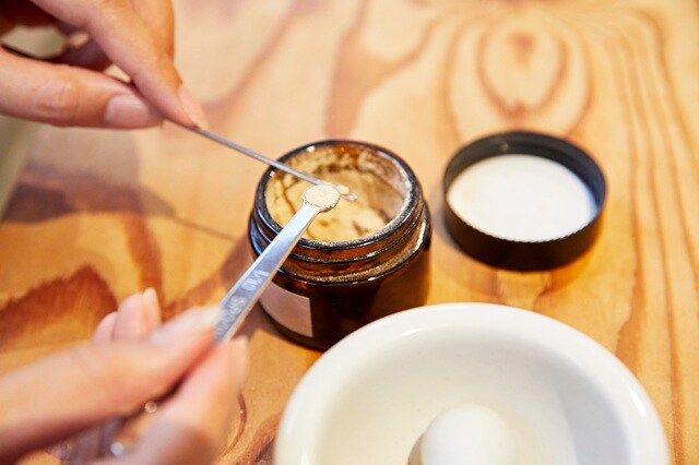 4種類の香料から好きな香りを選び、専用のスプーンで少しずつ白い器に投入。計10杯の香りを組み合わせて、混ぜていきます。
