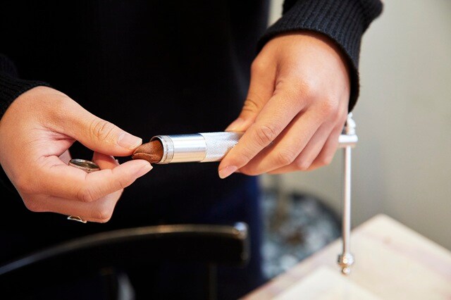 出来上がったお香のもとを専用の押し出し器に詰め、レバーをゆっくりと回していくと細長いお香がニュルっと出てきます。台の上で転がして形を整えていきます。