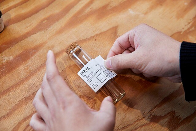 レシピノートのラベルをボトルに貼りつけ、タイトルをつけたら完成。できたてのお香はまだやわらかいため、一晩広げて乾燥させることが必要です。