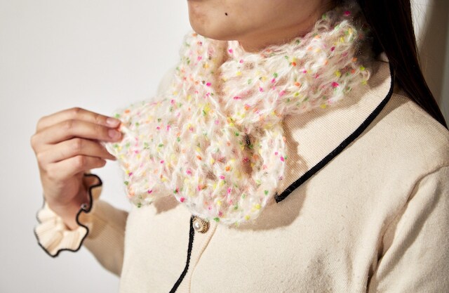 選んだ毛糸は、ふわっとした毛羽立ちで柔らかい触り心地のモヘア糸。メーカーが作ったマフラーの編み図付きで、糸も太く編みやすいのだそう。