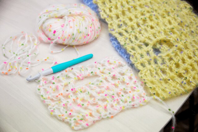 編み始めこそ「これ、ほんまに編めるんかな?」と不安でしたが、マスザキヤのスタッフの方々が丁寧に教えてくださったおかげで短時間で「楽しい!」と感じられるほどに。かぎ針すら握ったことのない「超初心者」の私でも2時間ほどでマフラーを編むことができました。