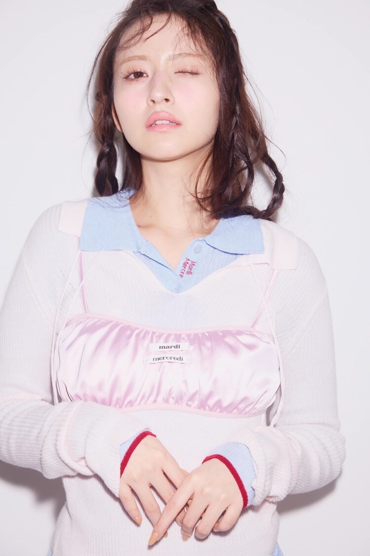 透け感のあるピンクとブルーのとろみニットを重ねて、サテンビスチエをプラス。ひとさじの赤を差し色に、ときめく配色をたっぷり満喫!なじみのあるピンクベースでトライしやすい。