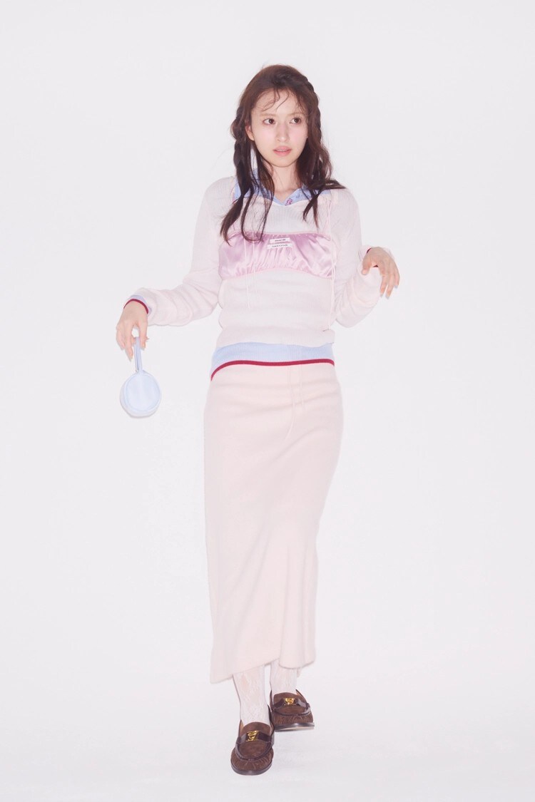 サテンビスチエ 9,900円、ブルーシアーニット17,050円/ともにMardi Mercredi(MARDI MERCREDI JAPAN) ピンクシアーニット 10,450円、ニットスカート 12,100円 /ともにCOCO DEAL(ココ ディール)バッグ 12,650円/minitmute(HANA SHOWROOM)レースタイツ 1,650円 /靴下屋(Tabio)ローファー 22,000円 /ル タロン グリーズ(ル タロン グリーズ ルミネ新宿店)
