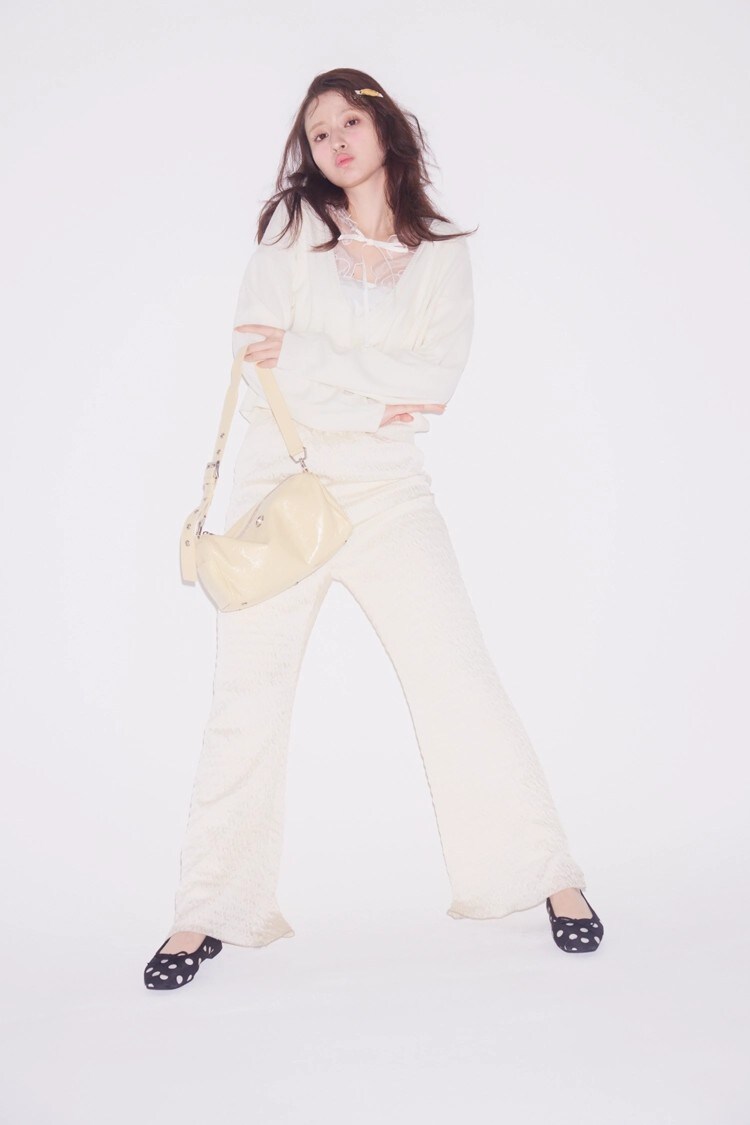 サテンパンツ 16,500円 /HONEY MI HONEY レースニット 14,300円/ユー バイ スピック&スパン(ユー バイ スピック&スパン ルミネ池袋店)ヘアクリップ 5,280円 /MUSEE.ART(HANA KOREA)ベージュバッグ 58,630円/minitmute(HANA SHOWROOM)リング 2,640円 /アネモネ(サンポークリエイト)バレエシューズ 7,590円 /ル デコレ(ル タロン 公式オンラインストア)インナー/スタイリスト私物