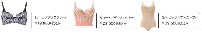 ラインアップは、3/4カップブラジャー、ハーフカップブラジャー、3/4カップボディスーツ(ワイヤー無)、3/4カップボディスーツ(ワイヤー入り)、ショートボディシェイパー、ガードル(裾レース・裾ヘム)、ハイウエストショートガードル、デザインショーツ、カラーバリエーションショーツと豊富。