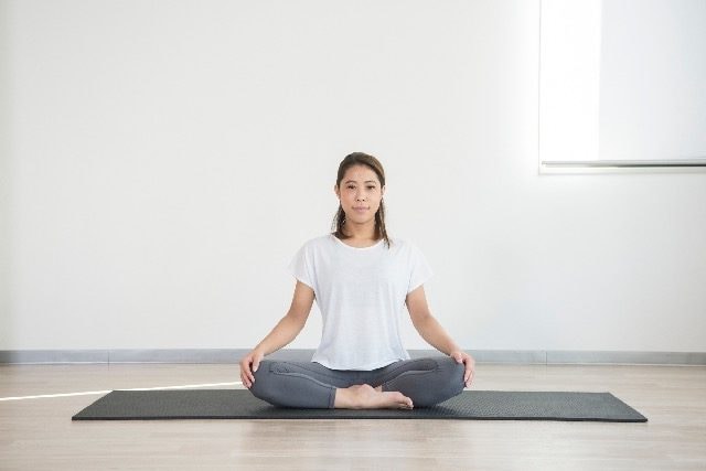 (1)床にあぐらで座り、両手を太ももの上に置く