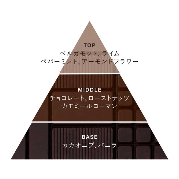 ミドルにはチョコレートとローストナッツ、カモミールローマンが広がり、ベースにはカカオニブとバニラの余韻。甘さの中に透明感を感じる香りは、日常にそっと寄り添う一本です。