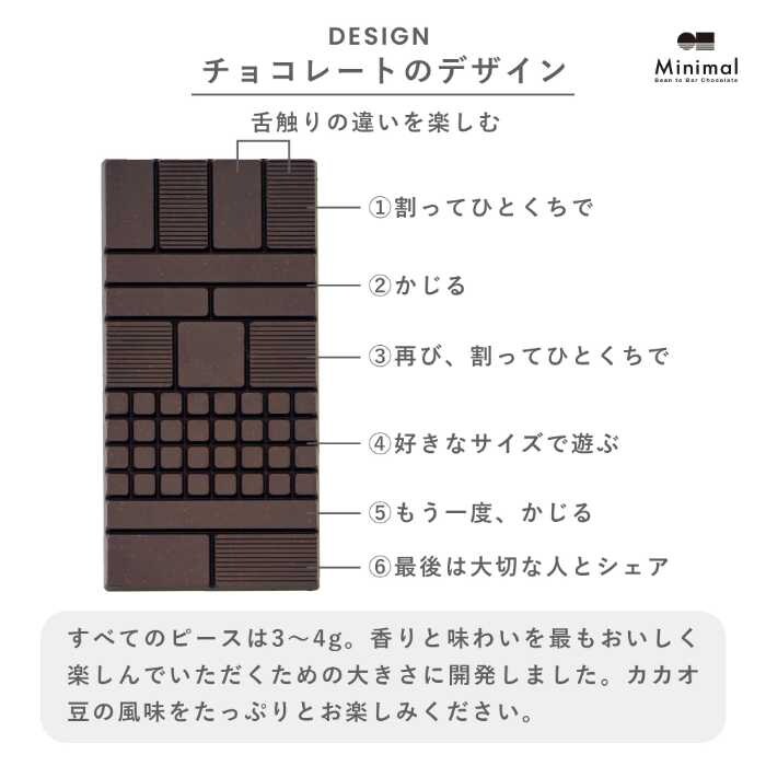 コラボレーション限定の「板チョコレート/タンザニア70%」は、カカオと砂糖のみを使用したMinimalならではの一枚。