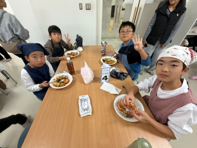 実際に活きた魚介を扱う機会は、子どもにとっても珍しい体験です。思うように動かない車えびに戸惑いながらも、班ごとに声を掛け合い、協力しながら調理を進めていきました。手順を分担したり、助け合ったりする中で、料理そのものだけでなく、仲間と一緒に作る楽しさも自然と生まれていたようです。