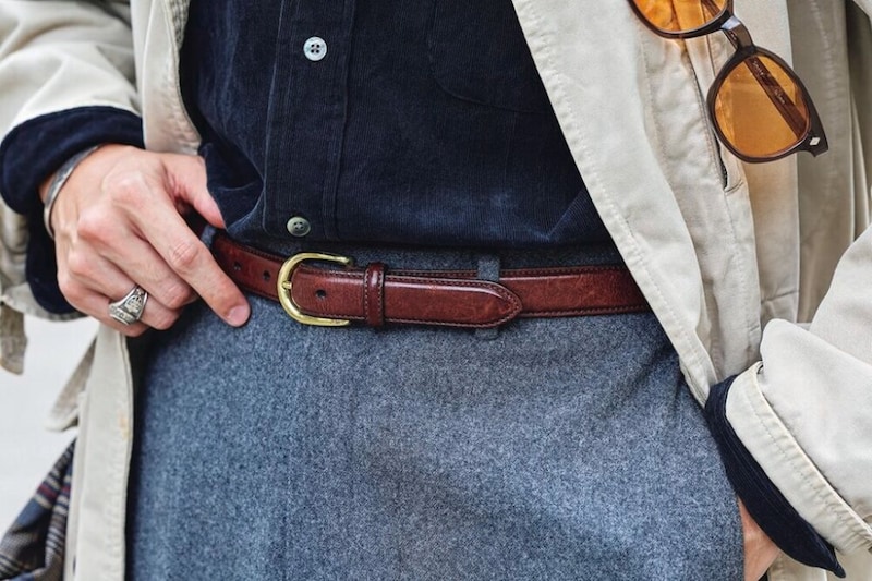 ブラックのコーデュロイシャツは地味ながらもパンチのあるアイテムなので、ボトムスにはプレーンなグレースラックスでバランスを考慮している。またブラックのベルトではなく、茶系を入れることで柔らかな印象にしているのもポイント。