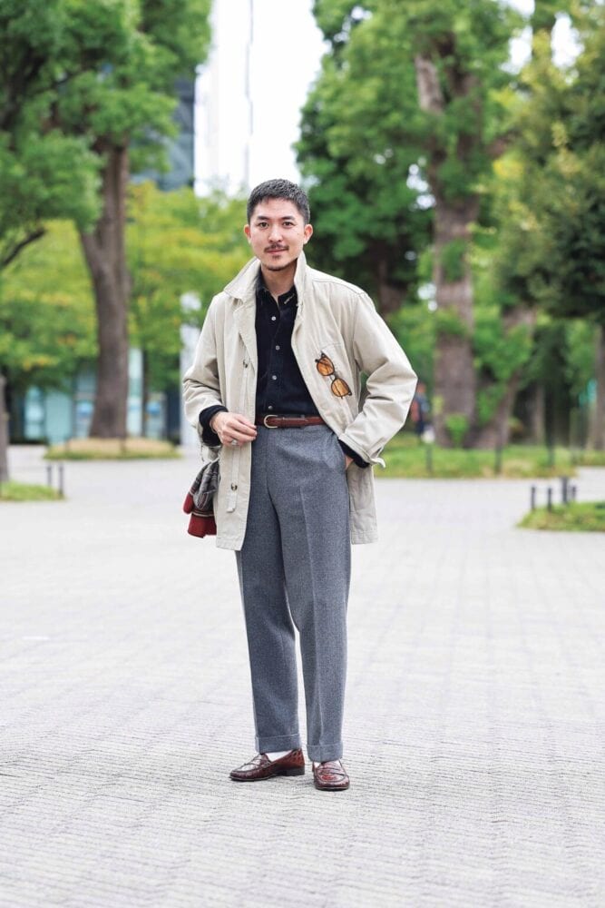 高校生の時からアメトラを嗜み、その趣味嗜好から学生時代より当社で働くという筋金入りのトラッド愛好者である庄子さん。王道のアメトラを深く知っていると黒は自然と避けてしまいそうだが、素材感さえ気をつければ、難なく取り入れられると断言。
