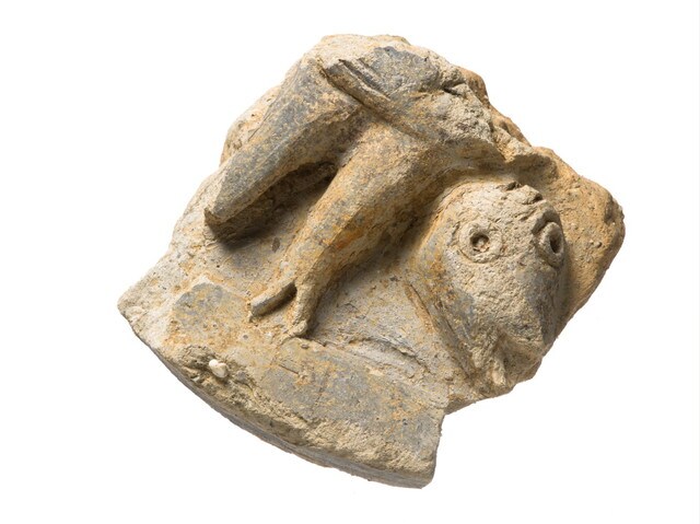 天守台出土金箔押し飾瓦/天守台の発掘調査で出土した金箔瓦で、豊臣期の天守で使われていたもの。
