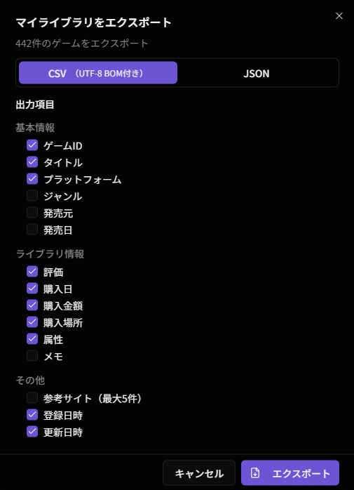 出力項目は任意に選択可能で、購入情報からプレイ記録の評価・メモまで、大切な記録を特定のサービスに閉じ込めることなく、将来にわたって自由に活用・保存できる環境を提供します。