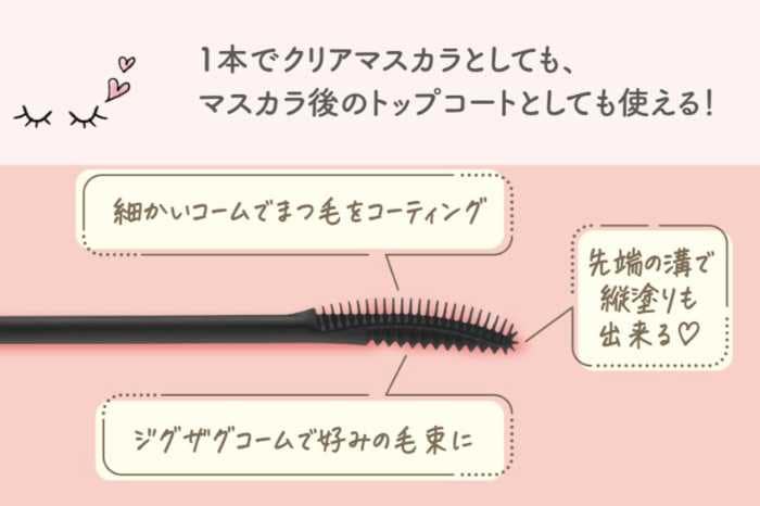 1本でクリアマスカラとしても、トップコートとしても使える2WAY仕様です。つるんとした濡れツヤまつ毛を演出しながら、まつ毛のカールをしっかりキープ。