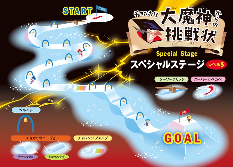 正確なスピード調整やバランス感覚が必要な「シーソーブリッジ」や、チューブの輪に設定されたベルを鳴らしながら滑る「ベルベル」、上下動を使ってスキーを加速させなが進む「チョッカリウェーブZ」、勇気を出して飛び越える「チャレンジジャンプ」など、スキーの技術だけでなく、冒険心やチャレンジ精神も求められるアイテムばかり。興奮とドキドキが詰まった特別なコースをぜひお試しあれ。