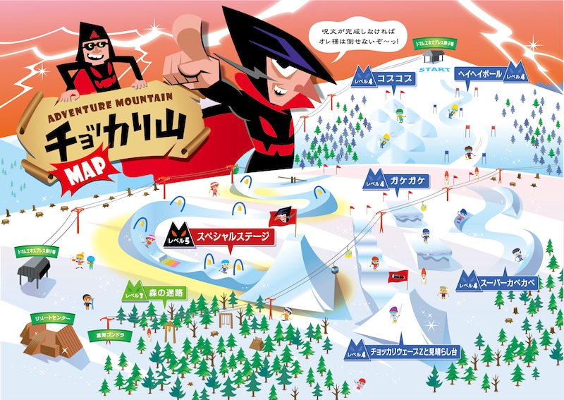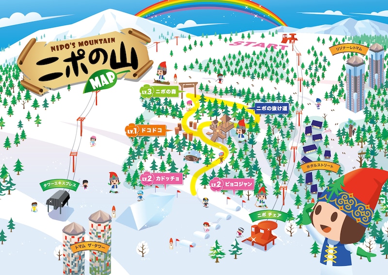 世界で唯一のストーリー型ファミリーゲレンデとして、子どもたちが主役となるこの滑走エリアでは、特別なストーリーが展開される。森の木を切り倒し、直滑降(チョッカリ)がしやすいゲレンデを作ろうと企むチョッカリ大魔神の野望を阻止すべく、11個のミッションに挑む。それらをクリアすることで、森の妖精「ニポ」を助けて森を守るのだ。各アイテムをクリアするたびに、チョッカリ大魔神を倒すために唱える呪文の1文字をゲット!