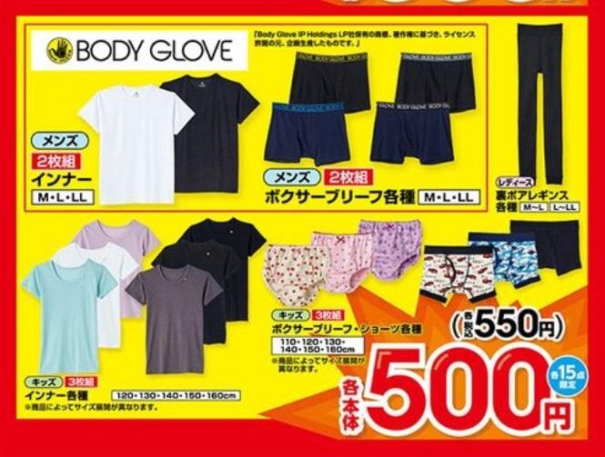 ほか、靴下や下着がスペシャルプライスで売り出されています。目玉はキッズ向けクルーソックス(15~20cm/19~24cm)5足組・330円、キッズ向けインナー(120cm~160cm)3枚組・550円などです。