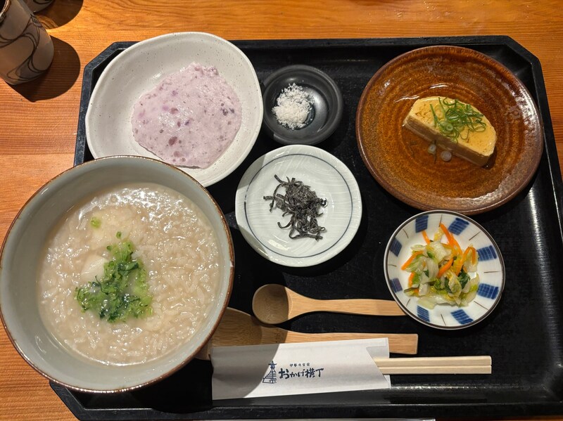 冷えた体を温めてくれるのが、「とうふや」で提供される早朝限定の「朔日粥」です。旬の食材をふんだんに使い、2月から12月まで月替わりで提供されます。