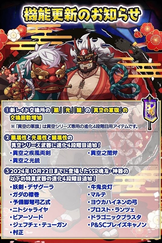3.2024年10月22日までに登場したSSR魂友・神器の特異武器の進化4段階目を追加!