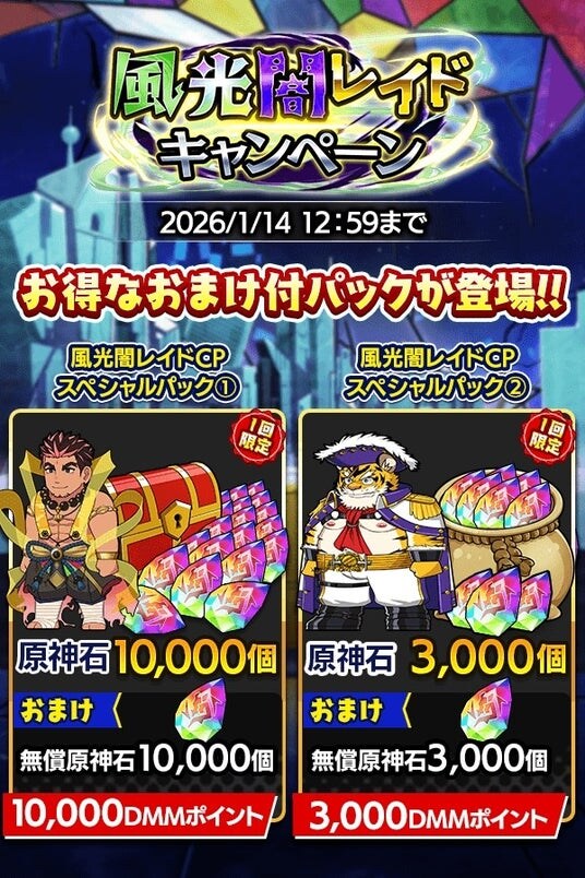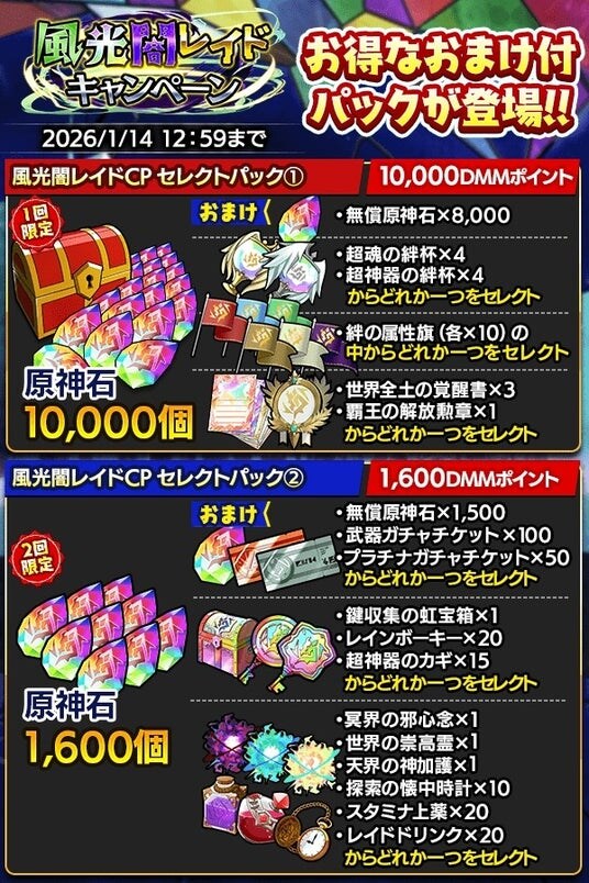 キャンペーン期間中、原神石がおトクに購入できる「風光闇レイドキャンペーンスペシャルパック」が2種登場!さらに原神石に加えて、ガチャチケットや限界突破アイテムなど、お好きなアイテムを選択できる「風光闇レイドキャンペーンセレクトパック」も2種登場!